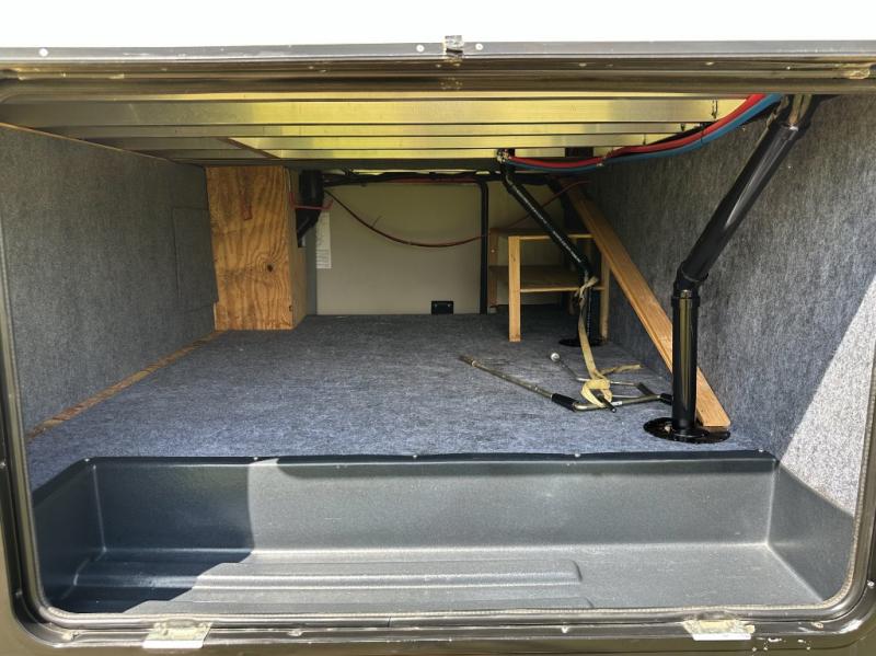 As you enter notice the free standing dinette to the left of door along with two lounge chairs in a large slide out. Along the rear wall find an entertainment center with a flat screen TV and overhead cabinets the entire width of the space.