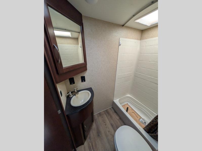In this Torque model 321 you will have plenty of space to move around with dual opposing slides in the main living area. To the left of the door there is a sofa with overhead storage and a dining table for mealtime use. A kitchen island is just off center and features a double sink, plus additional counter space for prep work. The kitchen slide offers additional counter space, a three burner range, and refrigerator. There is also a corner pantry off to the side. Above the counter there is a space for an optional 32" flat screen TV if you like.