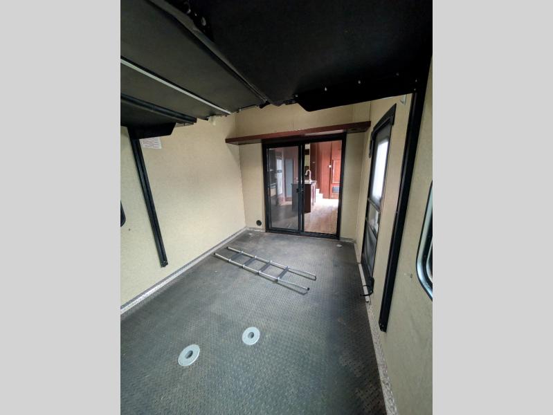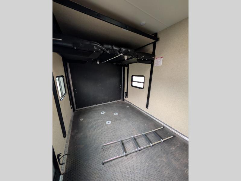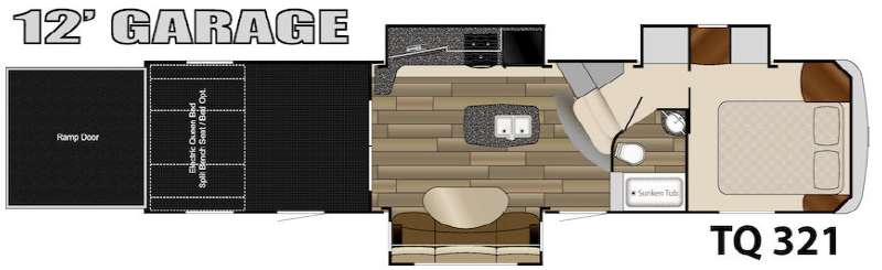 Head back through the unit and pass through the glass patio doors to a 12' garage space for your toys. The rear ramp door makes loading and unloading a cinch, and you can choose to add the electric queen bed split bench seat/bed option for added sleeping and lounging space after the toys are removed, and so much more!