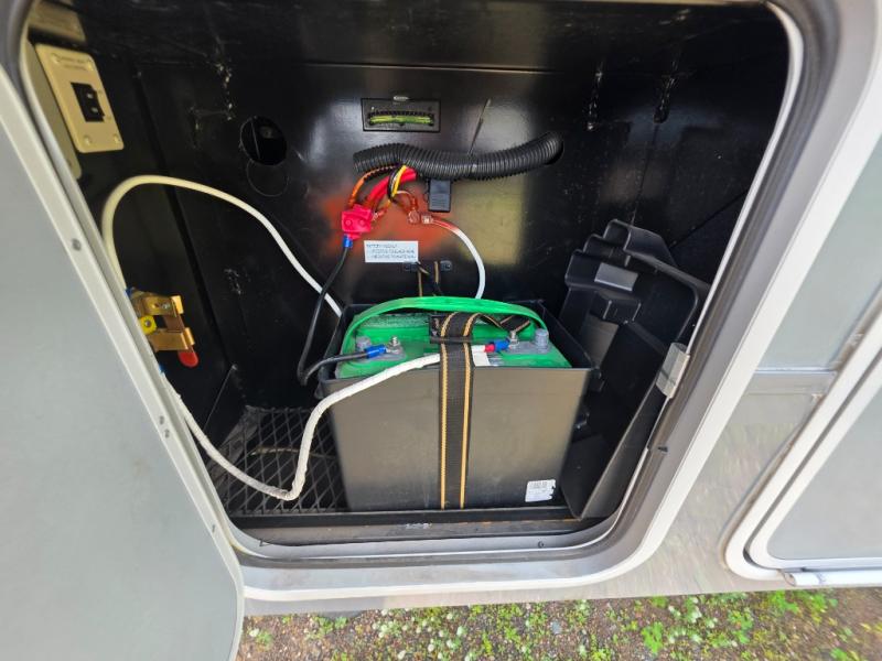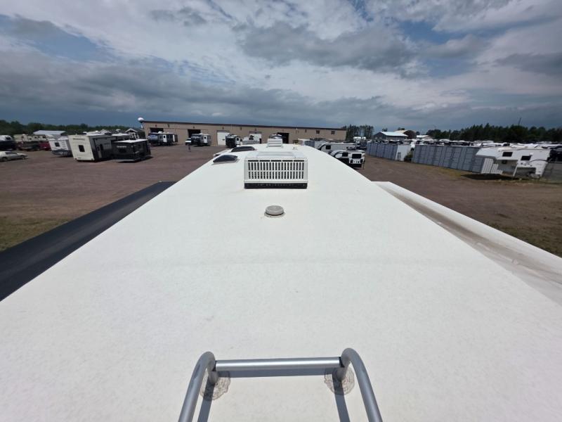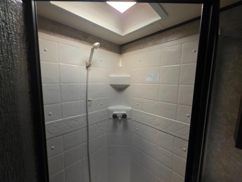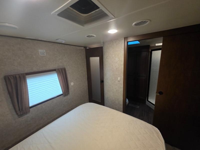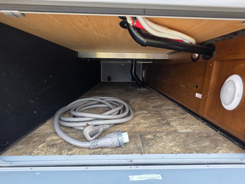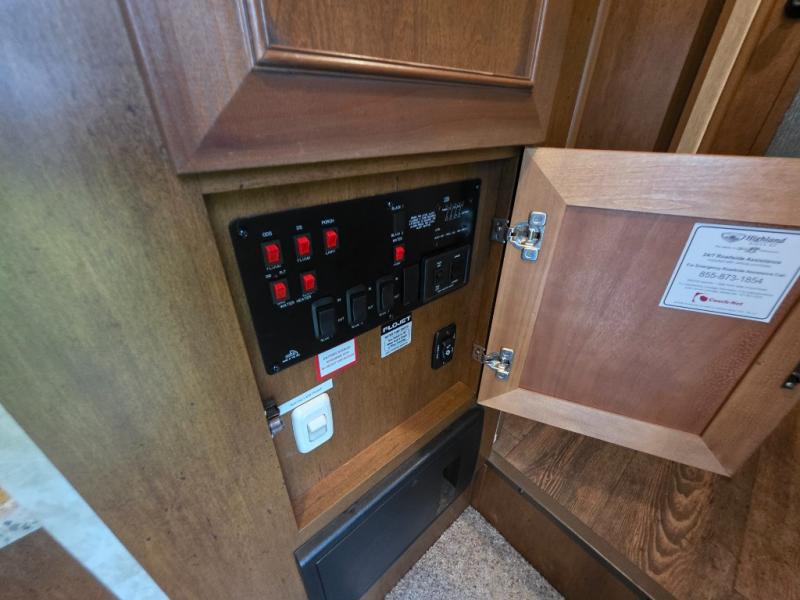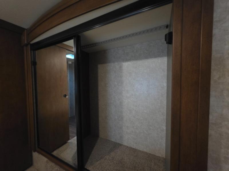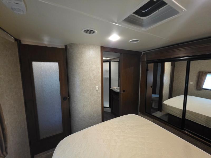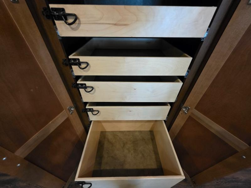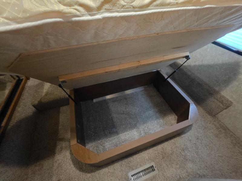 Step up the steps to the right of the entry door and find a complete bath and front bedroom suite. The bath provides a radius shower, sink, toilet, and linen cabinet that has also been prepped for a washer and dryer if you choose to add. The bath features a convenient pocket door that leads directly into the bedroom where you will enjoy a queen size bed including nightstands with open storage below and a cargo net on either side, plus a slide out wardrobe with mirrored doors, and drawers inside, plus so much more.