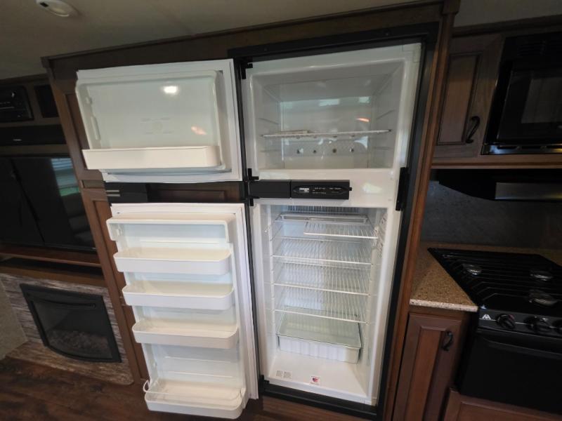 This Open Range Light fifth wheel model 319RLS features triple slides, a rear living layout with a fireplace, a convenient kitchen island on castors, and so much more!