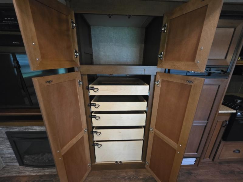 Opposite you will find a second slide out with a three burner range including an overhead microwave oven, a refrigerator, pantry, and entertainment center with fireplace below. The kitchen island on castors can be moved around to where you need it most whether for prep space while cooking, or to place snacks on while you hang out and enjoy family time inside. There is also a double kitchen sink along the interior wall that features additional counter space and overhead cabinets, plus storage below.