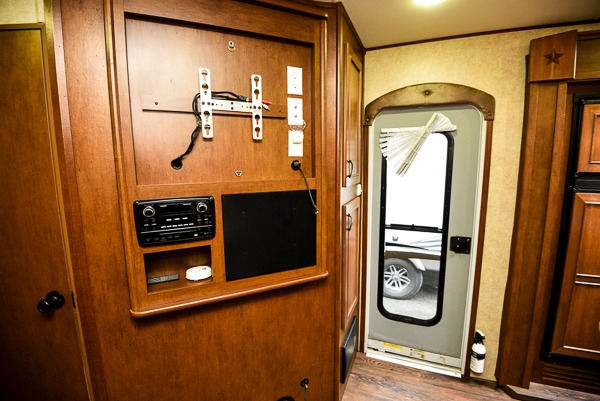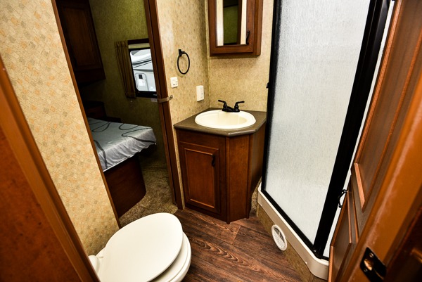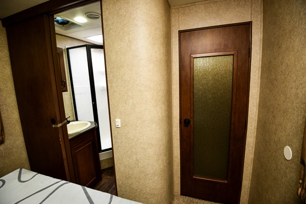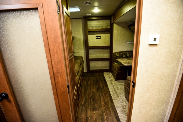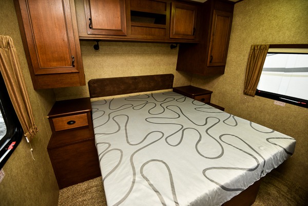 The front bedroom provides a restful retreat with a comfortable queen size bed, nightstands and shirt closets on both sides, plus overhead cabinets for more storage. You will even find a large pass-through compartment on the exterior that is located beneath the front bedroom.