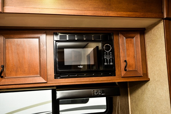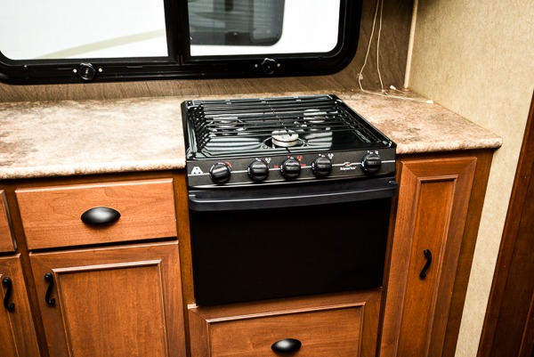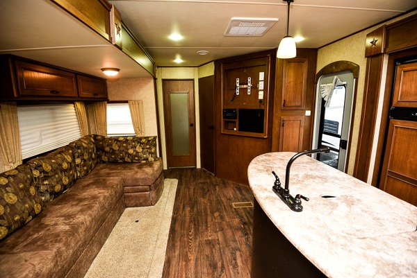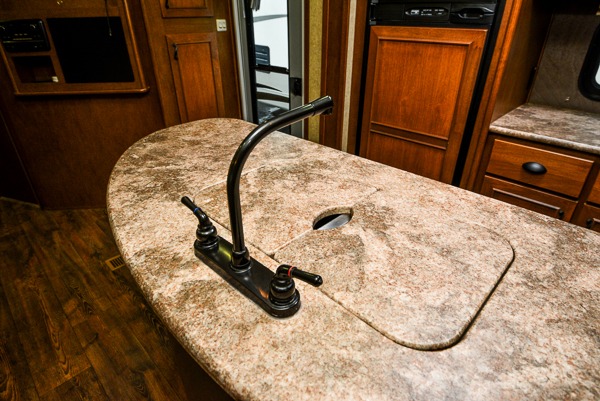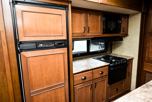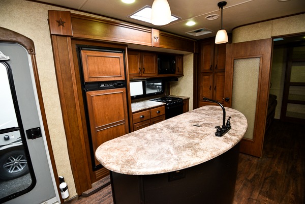 Step inside and see how easy camping with a large crew can be in this spacious unit. You will find the kitchen to the left of the door has everything needed to prepare and cook food. There is a refrigerator, counter space, a three burner range, and microwave slide. A pantry for your non-perishables and paper goods is next to the slide. The kitchen island includes double sinks making it convenient for prep work, storage, and more.