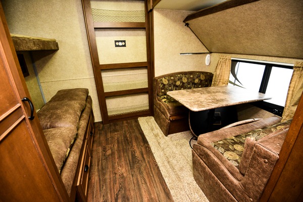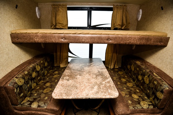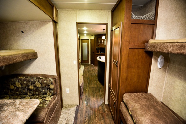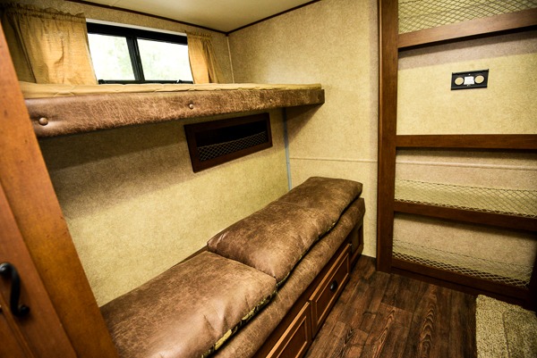 Back to the rear of this Open Range Light unit the bunkhouse is where you will likely find the kids. There is a booth dinette slide with a bunk above on the right, and a bench sofa with bunk above and storage below on the left side. You can choose to add an LCD TV between the two sets along the rear wall. There is also storage to the right just inside the bunkhouse door, plus so much more!