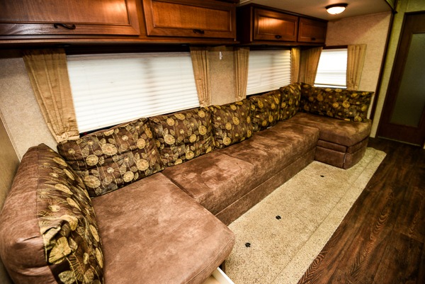 Opposite the door side is a large slide out U-shaped lounge with recliner ends and two dining tables. Plenty of space for everyone when it comes to mealtime. There are also overhead cabinets above for storage. Enjoy the LCD TV located across the room on the angled wall of the bathroom. You can even choose to add a wall-mounted fireplace below.