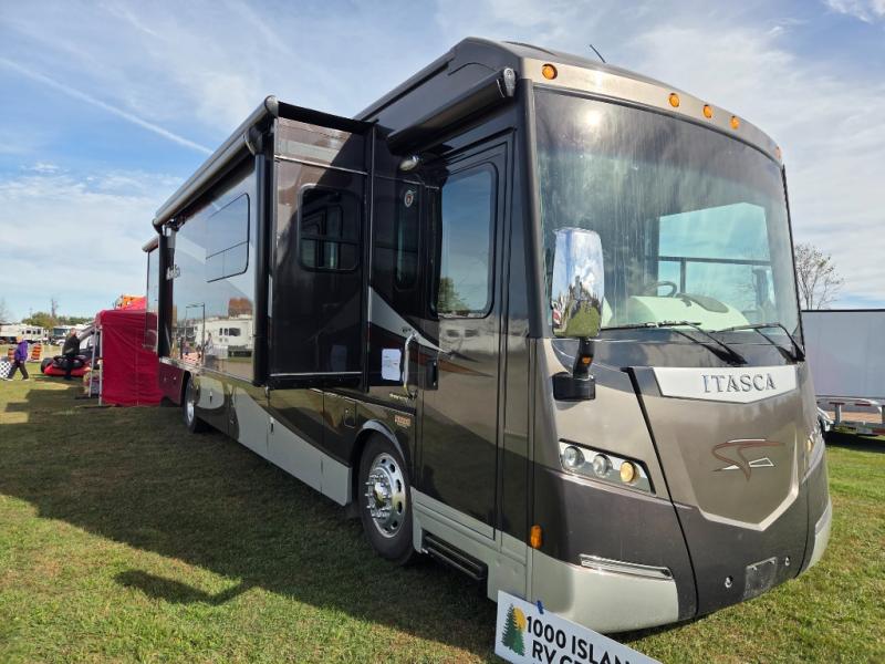 Itasca Meridian Class A Diesel w/Quad Slides, Rear Queen Bed Slide w/Nightstands, Ward./Storage, 32" LCD TV & Chest of Drawers Side, Private Shower & Sink, Private Toilet w/Sink, Pantry/4 Door Refrig./Dining Table & Chairs/Euro Recliner/40" LCD TV w/Pull-Out Table Slide, Rest Easy Extendable Sectional Sofa/Pull-Out Island/3 Burner Range & Dbl. Kitchen Sink Slide, Overhead Cabinets, Shelf & More! Available Options May Include: Wash/Dryer, King Bed, Fireplace, Res. Refrig., 2 Ottomans.