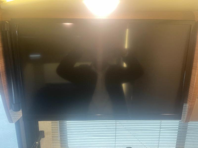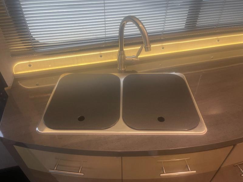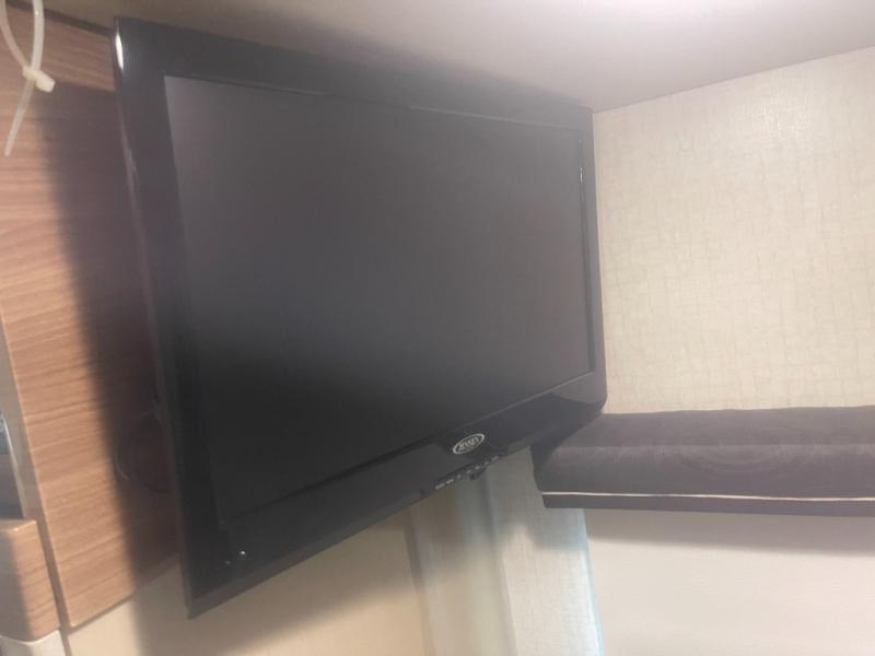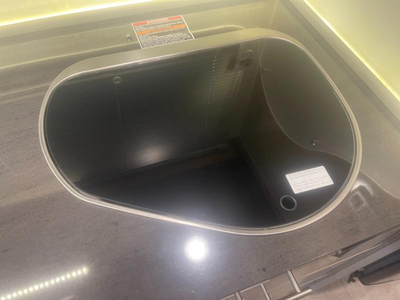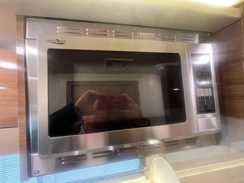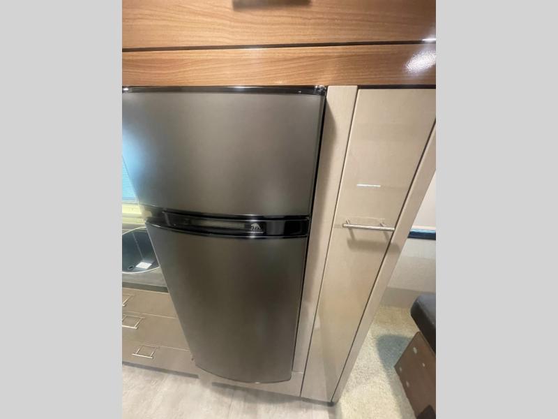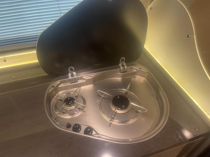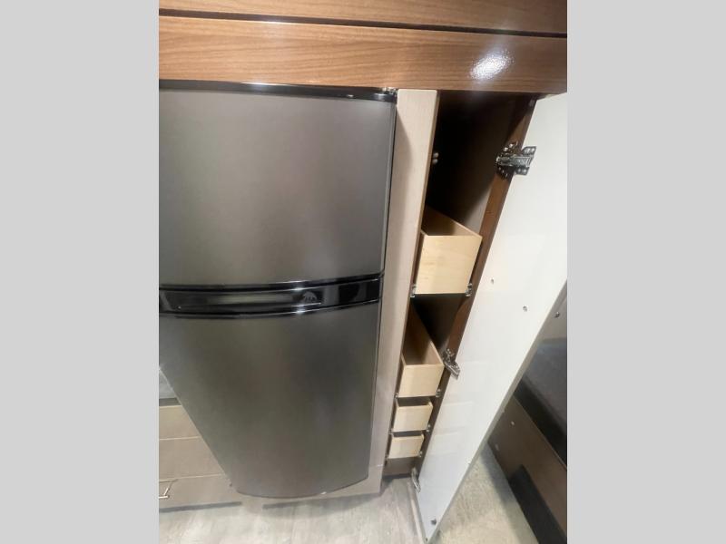 The kitchen area is to the left of the entry door and features a double sink, counter space, a two burner cook-top, pantry, and refrigerator. You will also find plenty of overhead cabinets for storage as well. There is also a 28" HDTV above the sink area for your enjoyment.
