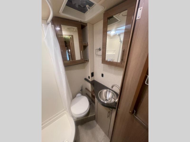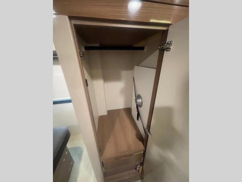 Beyond the sofa heading toward the rear of the coach you will find a side bath with corner shower, toilet, linen cabinet, and vanity with round sink. A nice sized wardrobe is found just around the corner from the bath before you step up to the bedroom floor area.