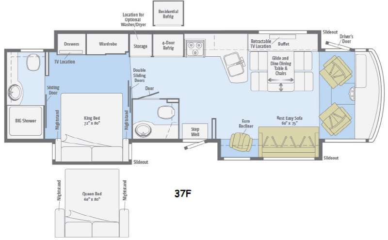 Opposite the door side in front enjoy meals at the Glide and Dine dinette with buffet and retractable 47" HD TV location found in the full wall slide. There is also a double kitchen sink, counter space, three burner range, 4 door refrigerator, a storage cabinet that is perfect for an optional washer and dryer if you like, and the bedroom wardrobe and chest of drawers, plus 28" HD TV location too.