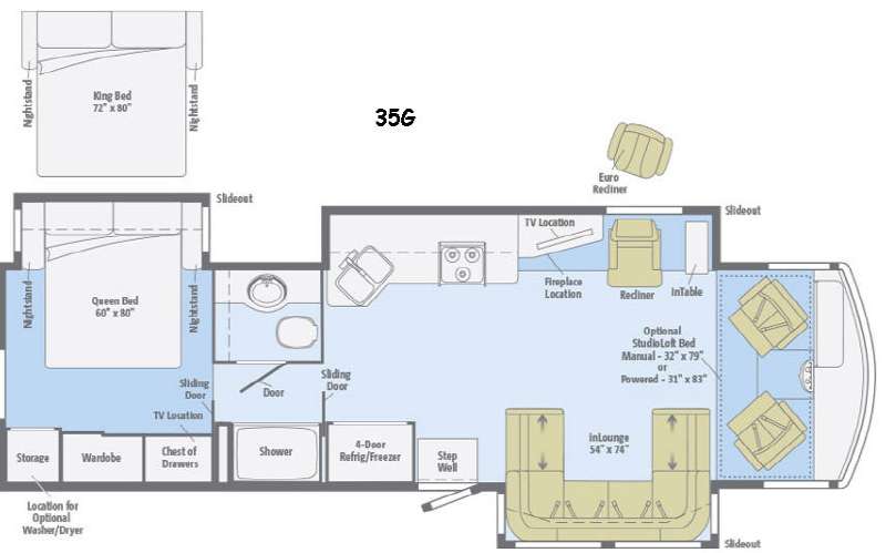 Choose an optional king size bed, Euro recliner, powered or manual StudioLoft bed above the cab area, and so much more!