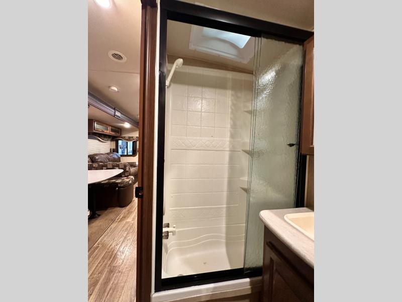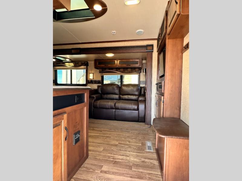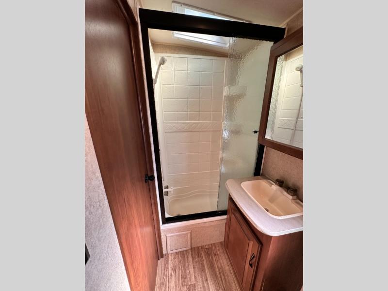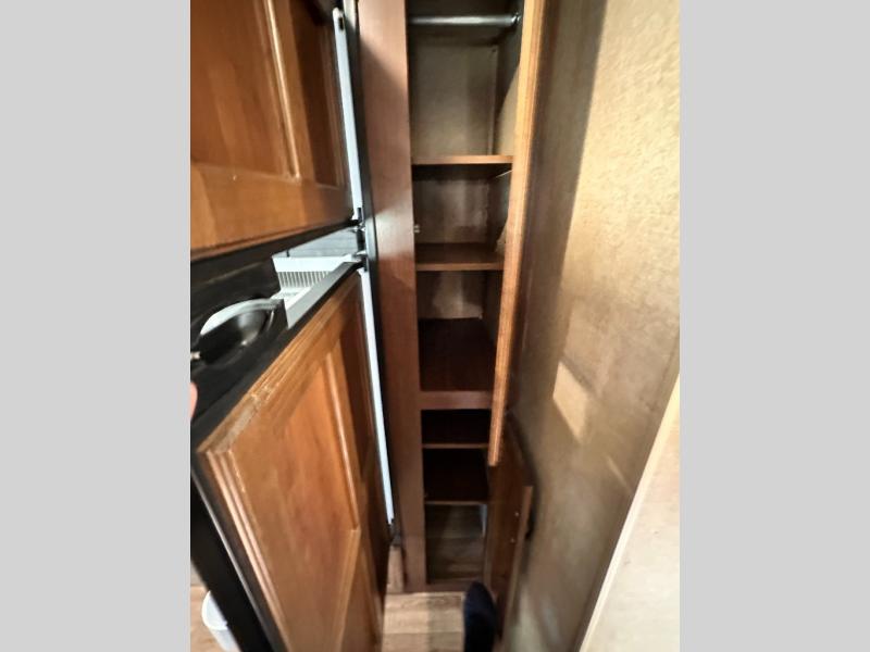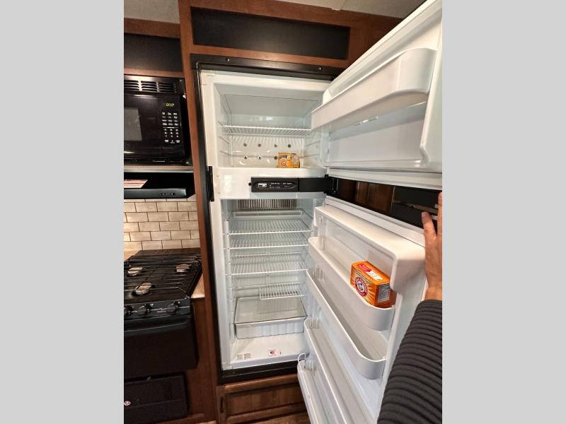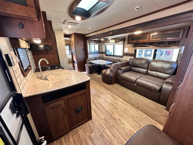As you enter the travel trailer, to the left is a double kitchen sink, three burner range, microwave, refrigerator, and pantry. The opposite side of the travel trailer offers a slide with an extendable u-dinette and a j-steel sofa, or an optional hide-a-bed sofa. Next to the sofa is an entertainment center and a bench.