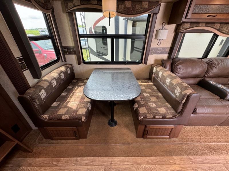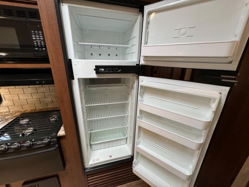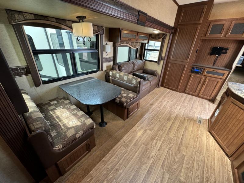 Stepping inside the fifth wheel, to the left there is a double kitchen sink, three burner range, microwave, refrigerator, and pantry. On the opposite side of the fifth wheel there is a slide with a dinette and a hide-a-bed sofa. The slide helps to open up the floor space and gives a bit more room.