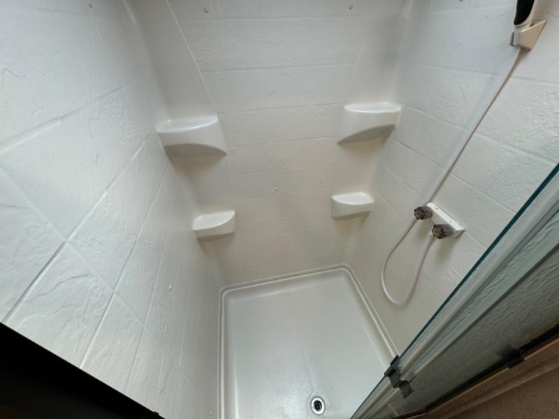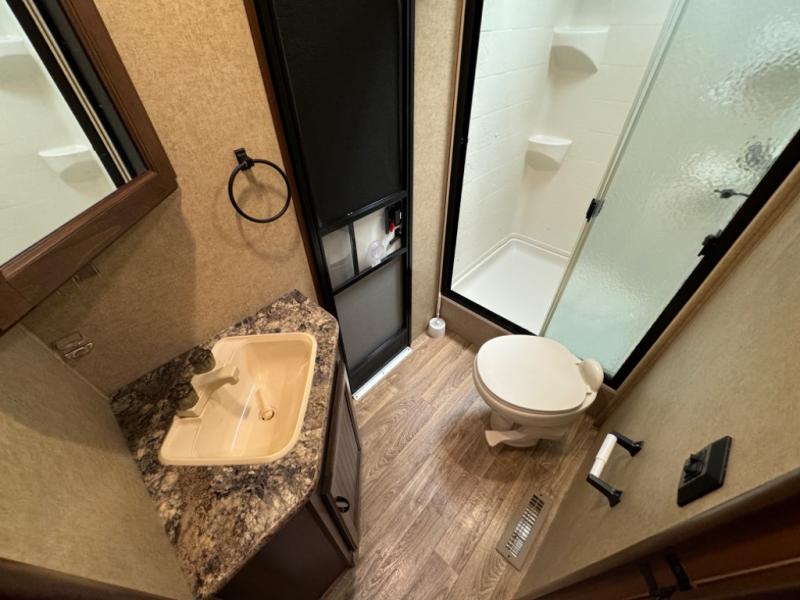 The bathroom is located in the rear of the fifth wheel. Inside the bathroom you will find a shower, toilet, sink, and medicine cabinet. There is also a private entrance leading outside from the bathroom.
