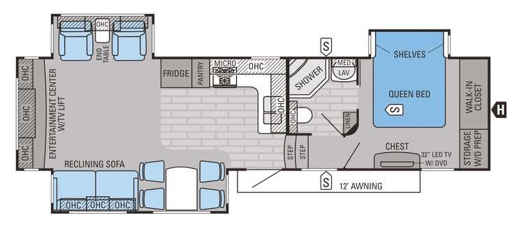 When you enter this fifth wheel, you will be in the kitchen and living areas. The kitchen has a double kitchen sink, three burner range, microwave, pantry, and refrigerator. There is much counter space with the l-shaped counter. In the living area you will find two slides, the first slide has two lounge chairs and an end table, the other slide offers a free-standing table and a hide-a-bed sofa with an ottoman. The rear wall has an entertainment center with TV lift.