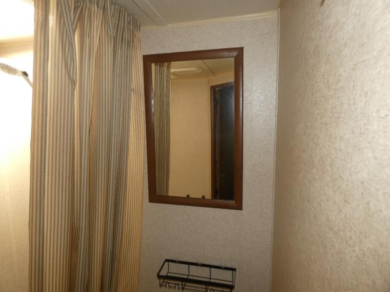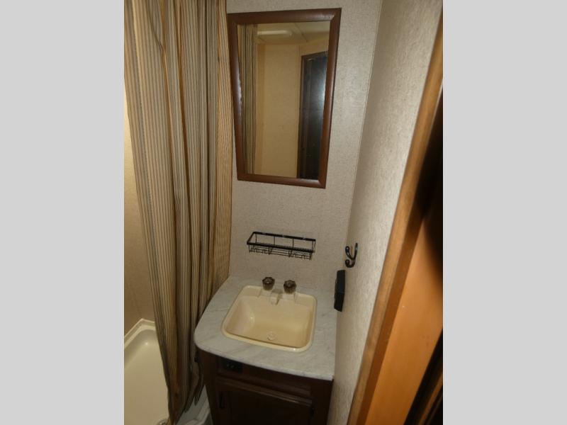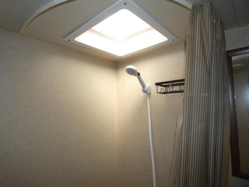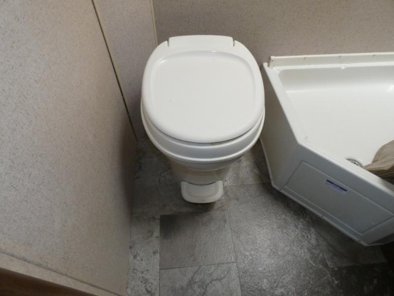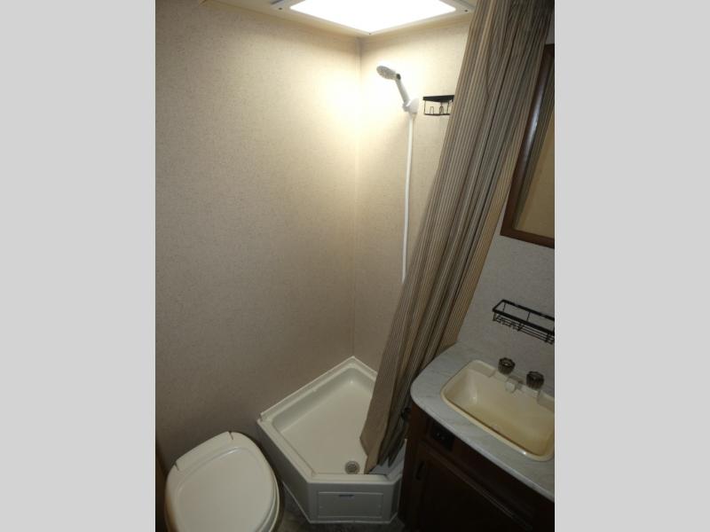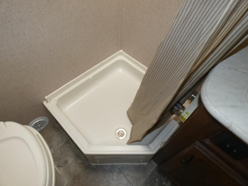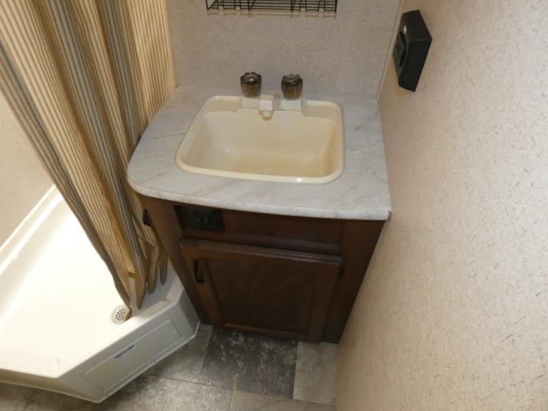 The bathroom is located in the rear. You will find a toilet, corner shower, and sink.