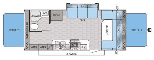 The X23B Jay Feather Ultra Lite expandable by Jayco offers front and rear expandable beds, and a single slide.