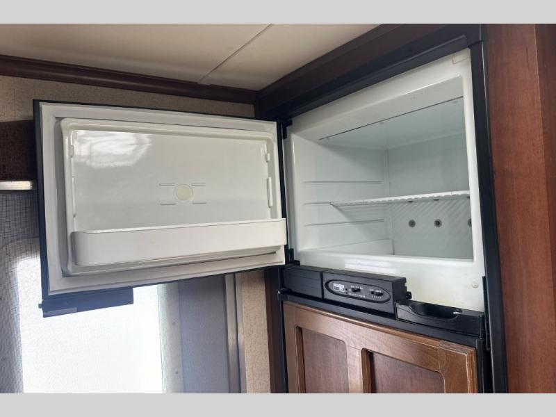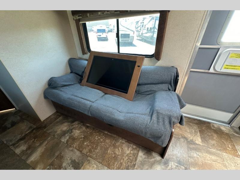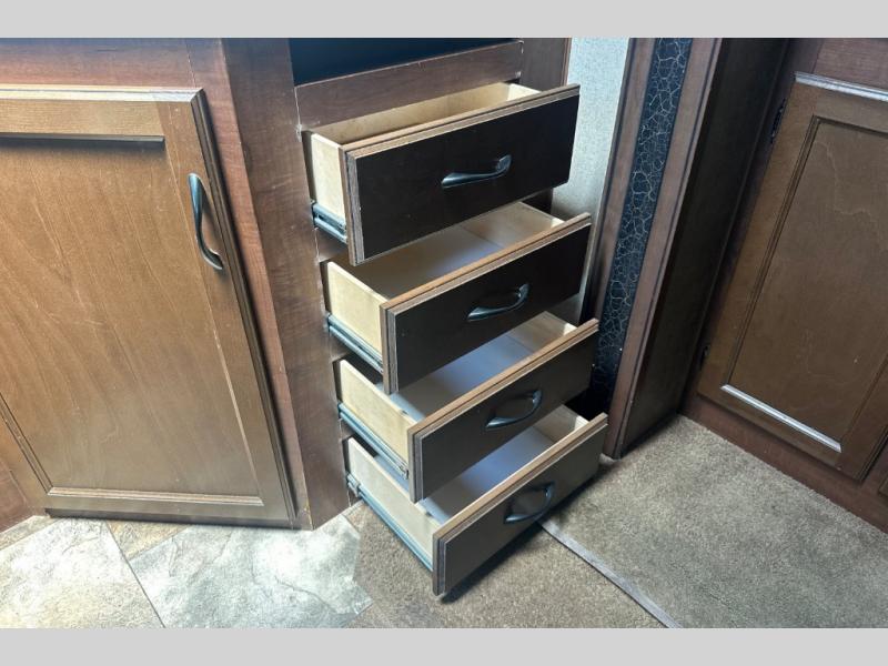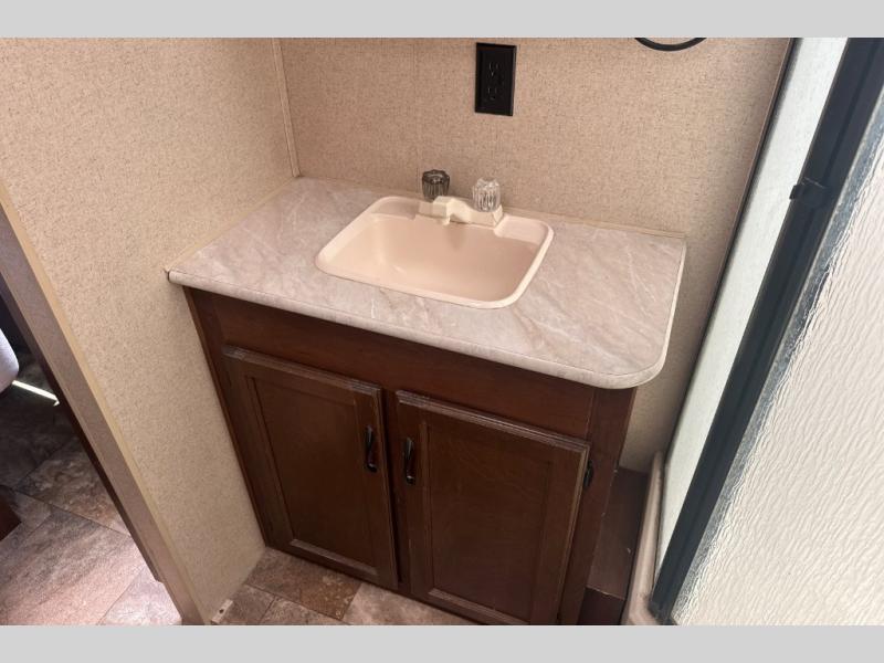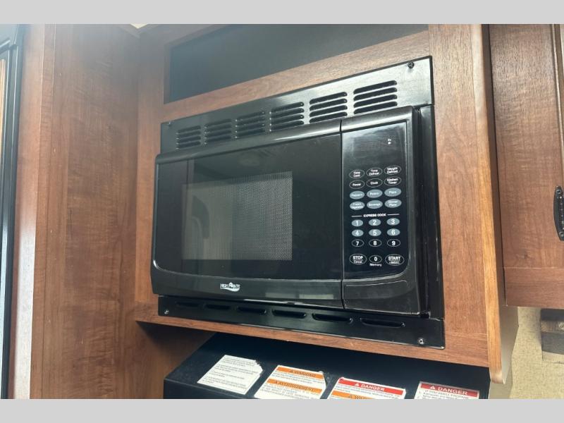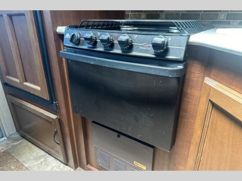 As you enter the rear entrance of the travel trailer you will find that there is a rear kitchen. Along the rear wall there is a refrigerator, three burner range, microwave, and double kitchen sink. The slide has an entertainment center with storage and a u-dinette. Next to the slide you will find a linen cabinet. On the opposite side of the trailer there is a sofa.