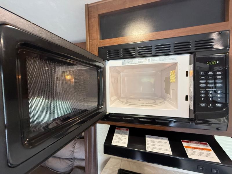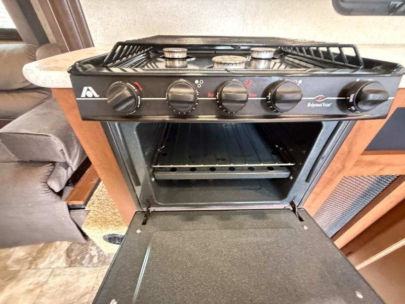 The main living area offers a refrigerator and a dinette on one side of the trailer. The opposite side of the trailer has a sofa slide, three burner range, microwave, and double kitchen sink.