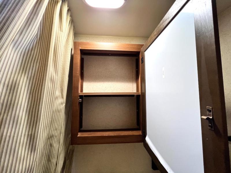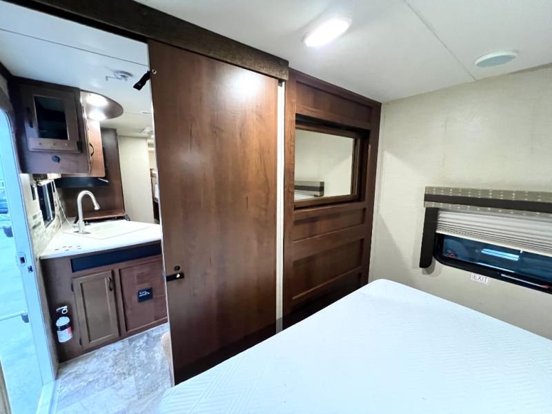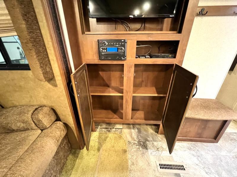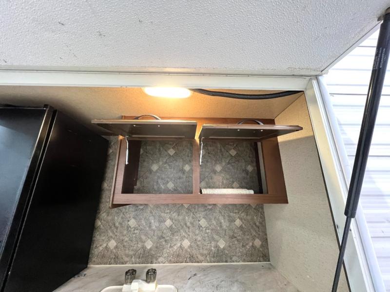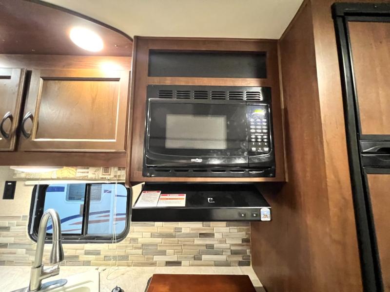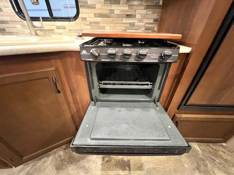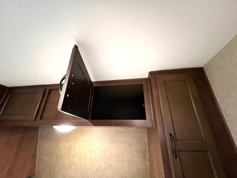 You will find plenty of overhead cabinets throughout the trailer as well as exterior storage. Outside you can enjoy the exterior kitchen which offers a refrigerator, sink, and slide out stove.