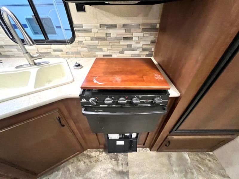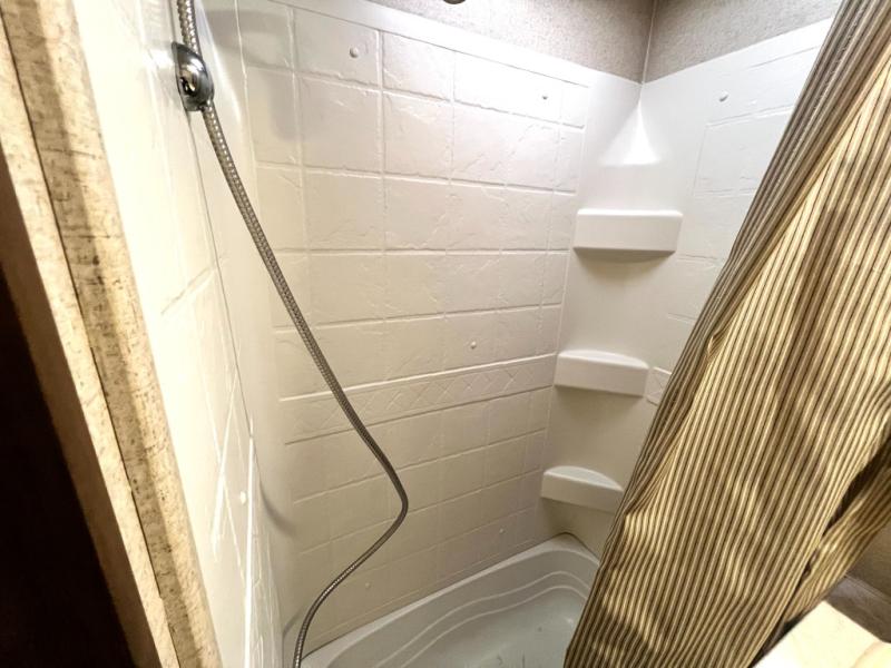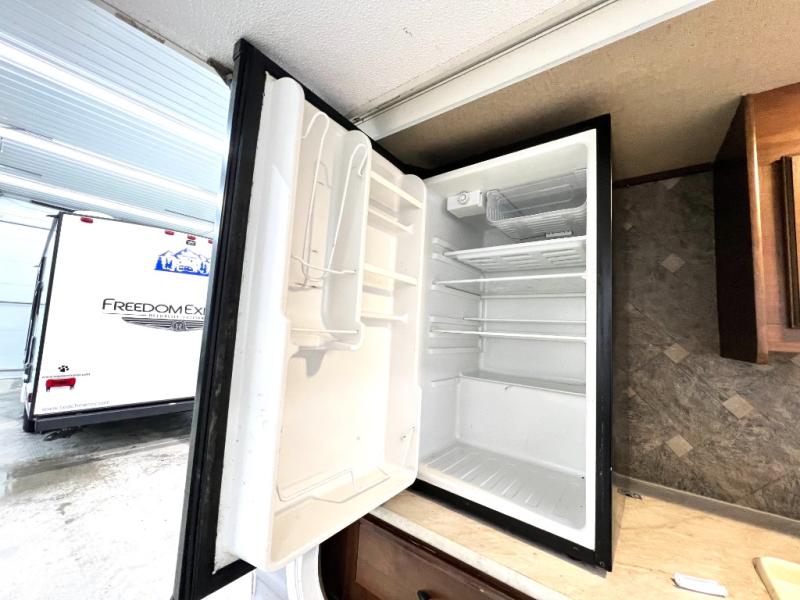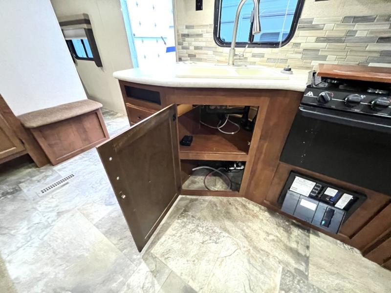 As you enter the travel trailer, to the left there is a double kitchen sink, three burner range, and refrigerator. The opposite side of the trailer has a slide with a sofa or an optional hide-a-bed, and a u-dinette. Next to the slide you will find a large pantry. There is a nice size entertainment center next to the sofa as well as a bench/storage.