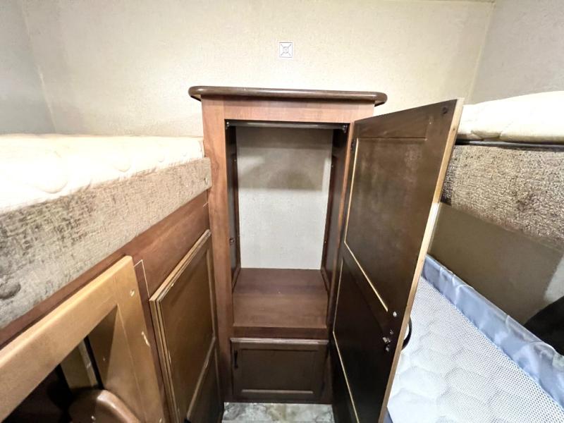 The rear bunk house has a set of bunks on one side and an upper bunk on the opposite side. You will also find a wardrobe/TV cabinet.