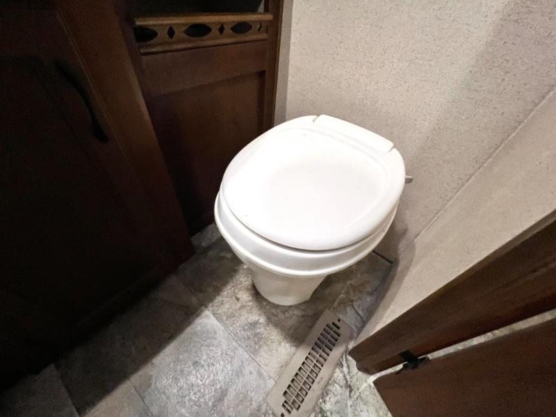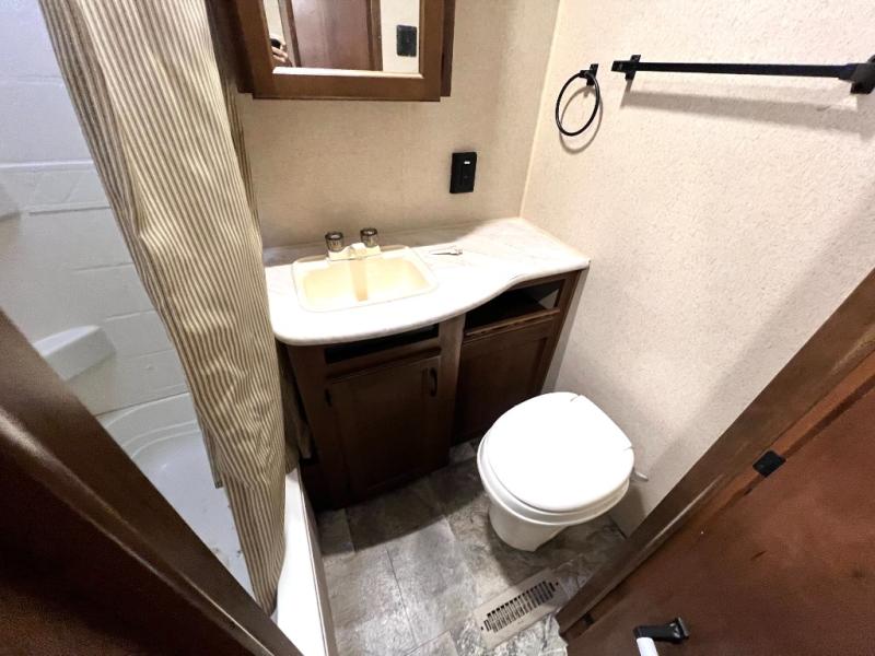 Toward the rear of the travel trailer you will come to the bathroom on the left. Inside the bathroom there is a toilet, sink, medicine cabinet, and tub/shower.