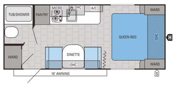 As you enter the travel trailer, to the left is a wardrobe. Continuing in the rear you will find the bathroom with a toilet, tub/shower.