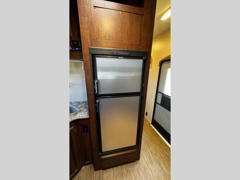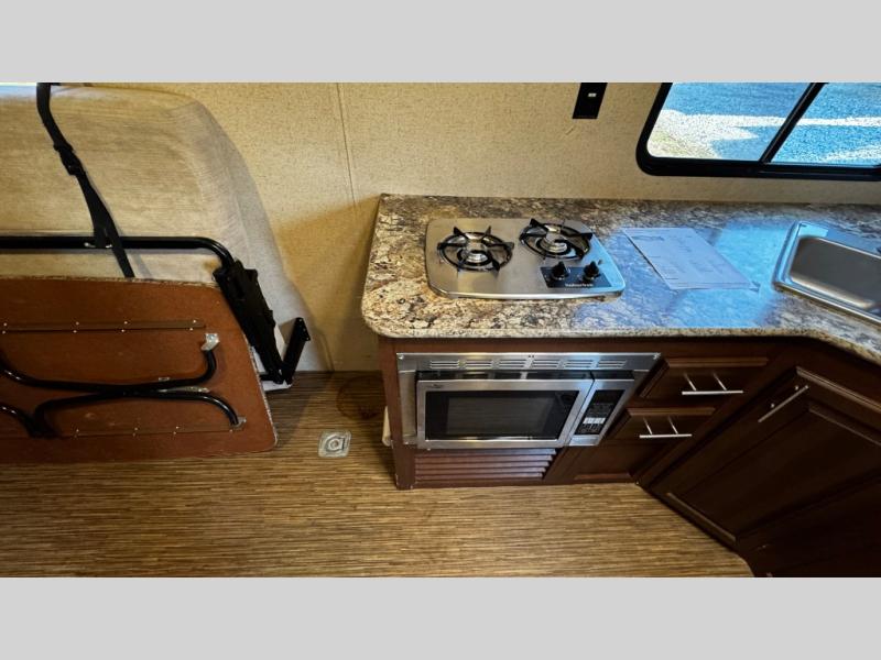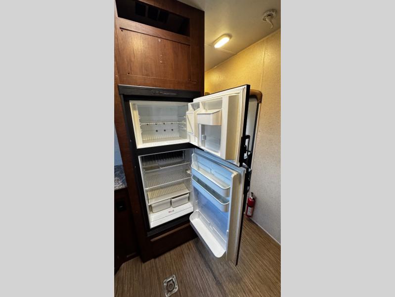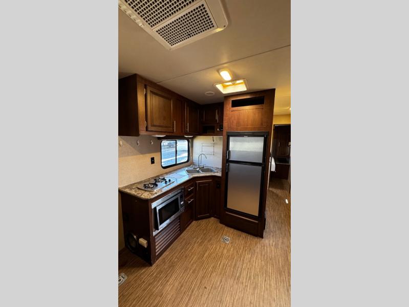 The kitchen has a two burner range, microwave, double kitchen sink, and refrigerator on one side of the trailer. Across from the range you will find a nice pantry which provides additional storage for your food items.