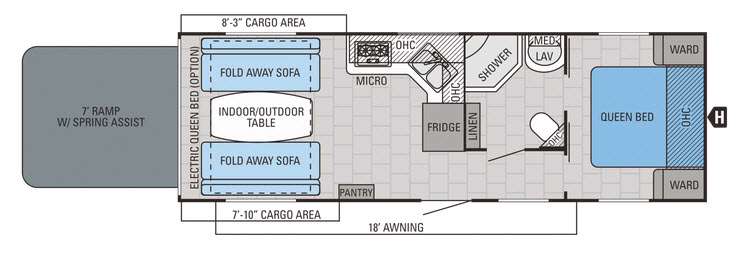 The Octane 273 toy hauler travel trailer by Jayco offers a 7' ramp with spring assist for easy loading and unloading your off-road toys. In the cargo area you will find two fold away sofas and an indoor/outdoor table. You can even choose an optional electric queen bed above the fold away sofas.