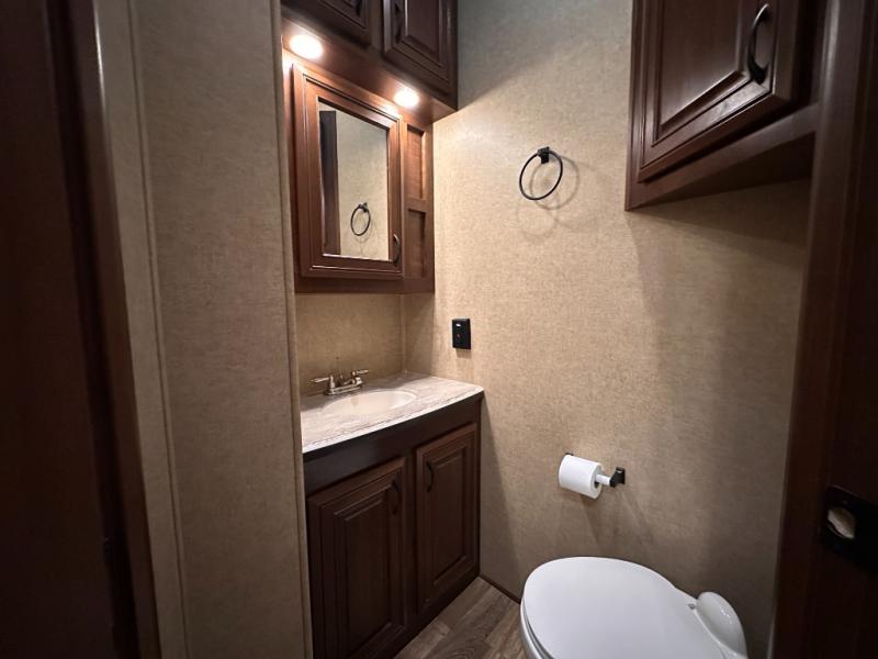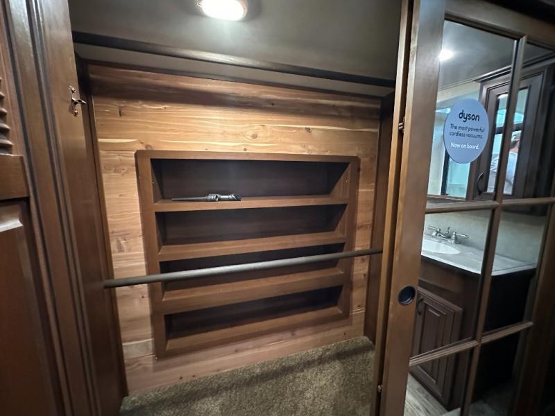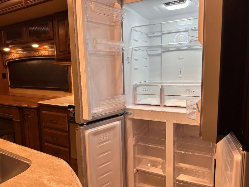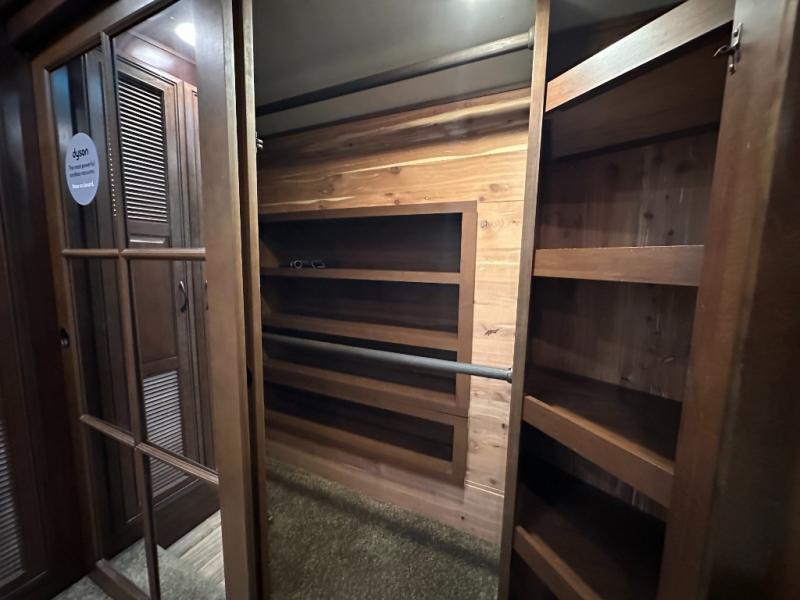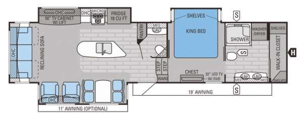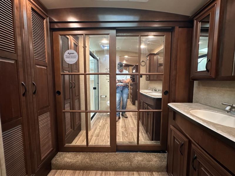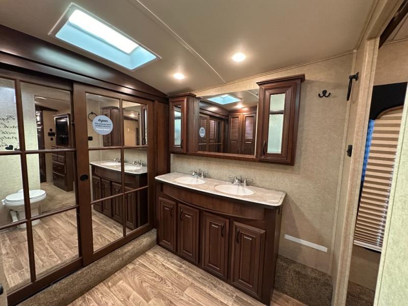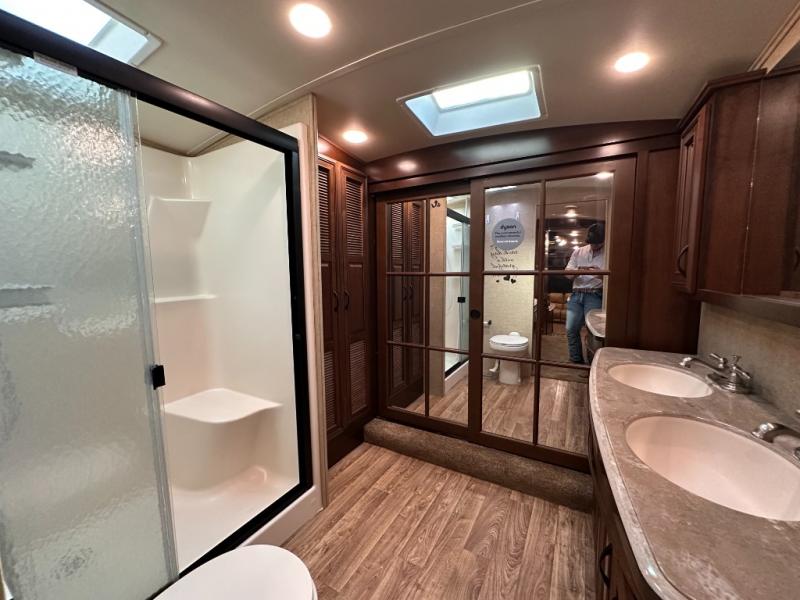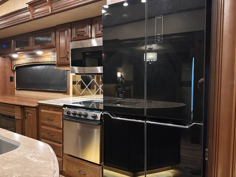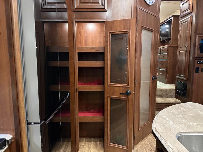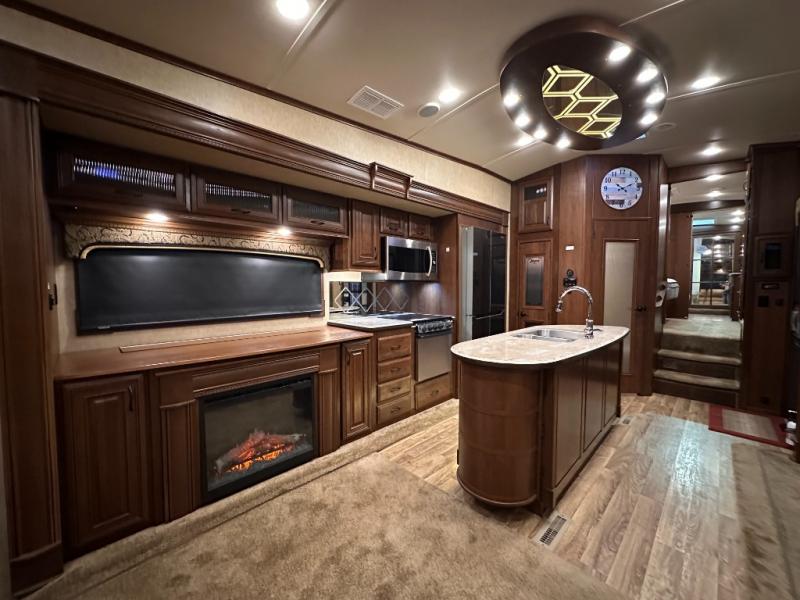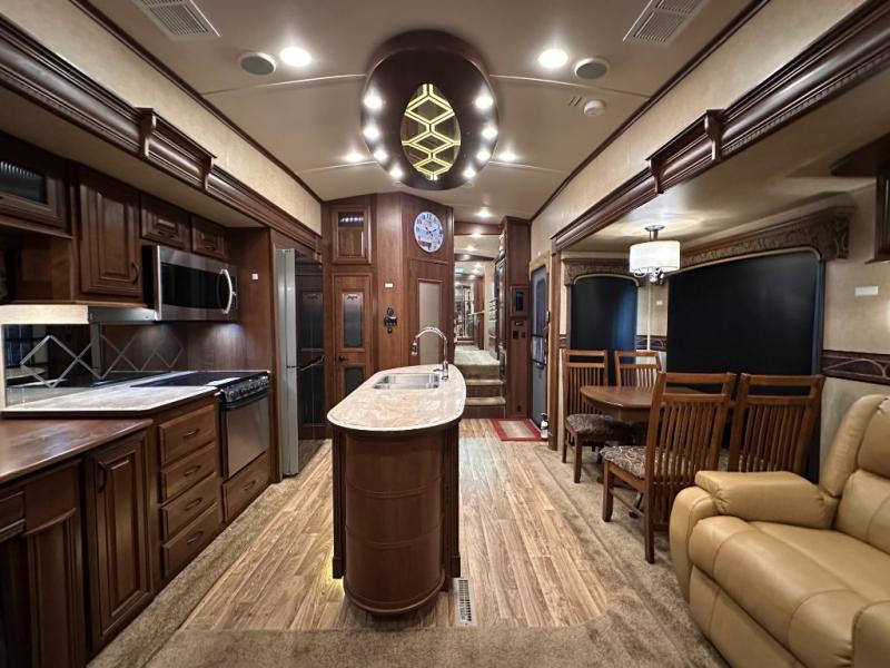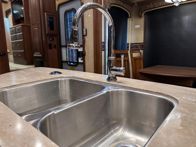 As you enter the fifth wheel, to the left there is a slide with a free-standing table and chairs which can comfortably seat four people, and two lounge chairs. Along the rear wall there is a reclining sofa. The other slide offers a 50" TV cabinet with lift, three burner range, microwave, and refrigerator. Next to the slide you will find a large pantry. The kitchen island has a double kitchen sink and extra counter space.