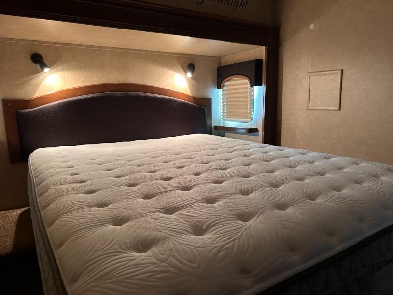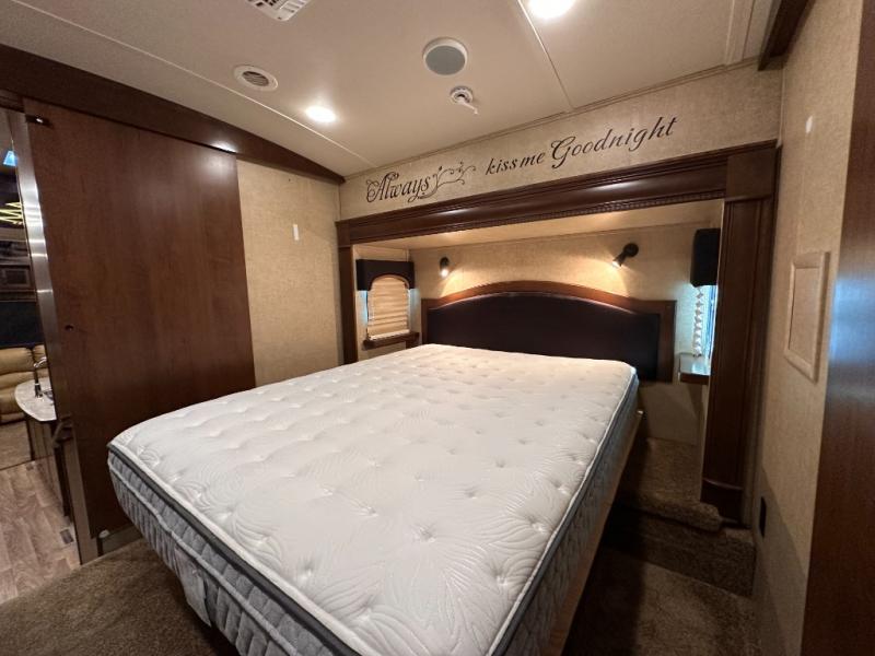 Stepping up the stairs, you will enter into the bedroom. Along one wall you will find a king bed slide. On the opposite side of the bed there is a chest with a 32" LED TV with DVD.