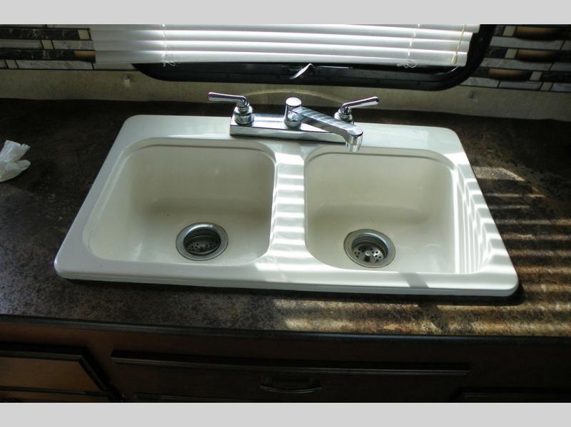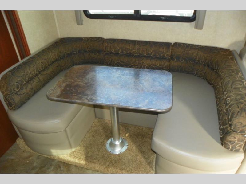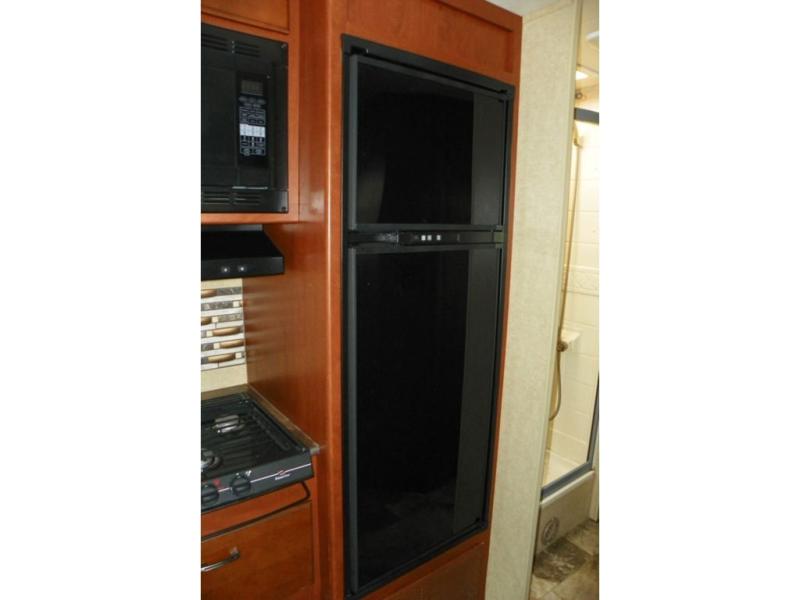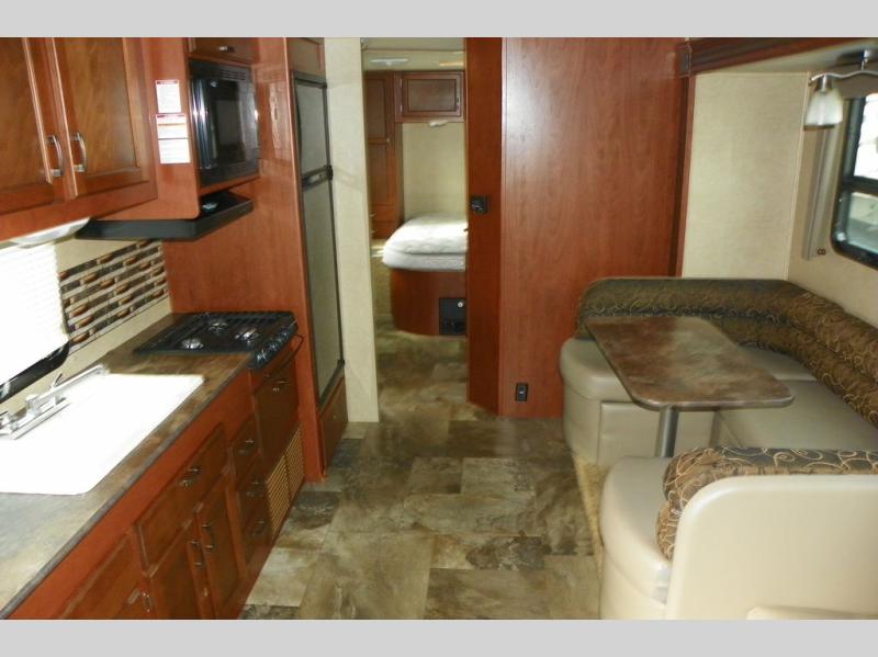 As you enter the motor home, to the left is a nice counter area, double kitchen sink, three burner range, microwave, and refrigerator. The slide has a sofa and u-dinette.