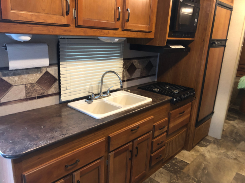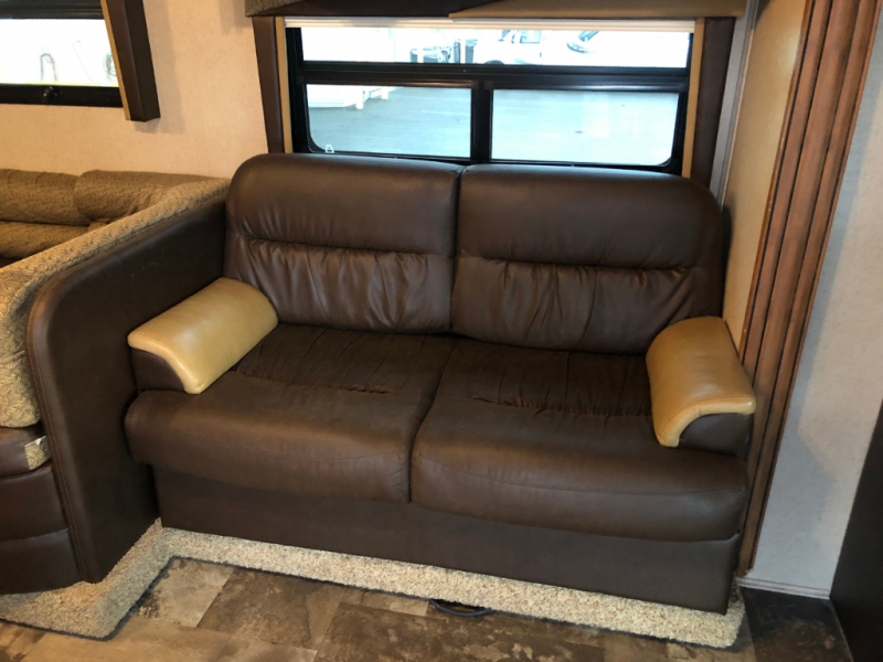 As you enter the motor home, to the left is a nice counter area, double kitchen sink, three burner range, microwave, and refrigerator. The slide has a sofa and u-dinette.