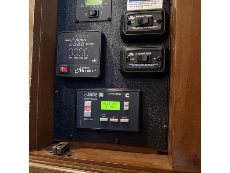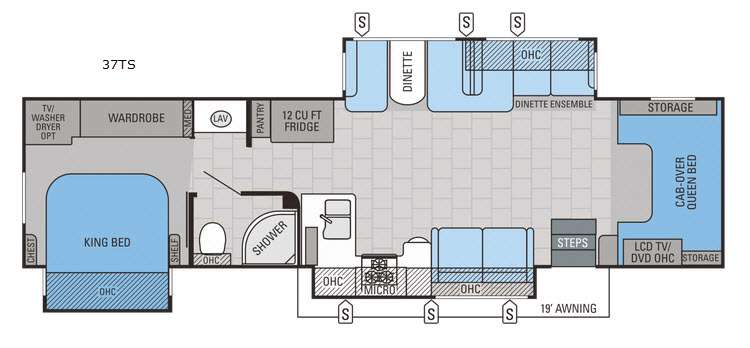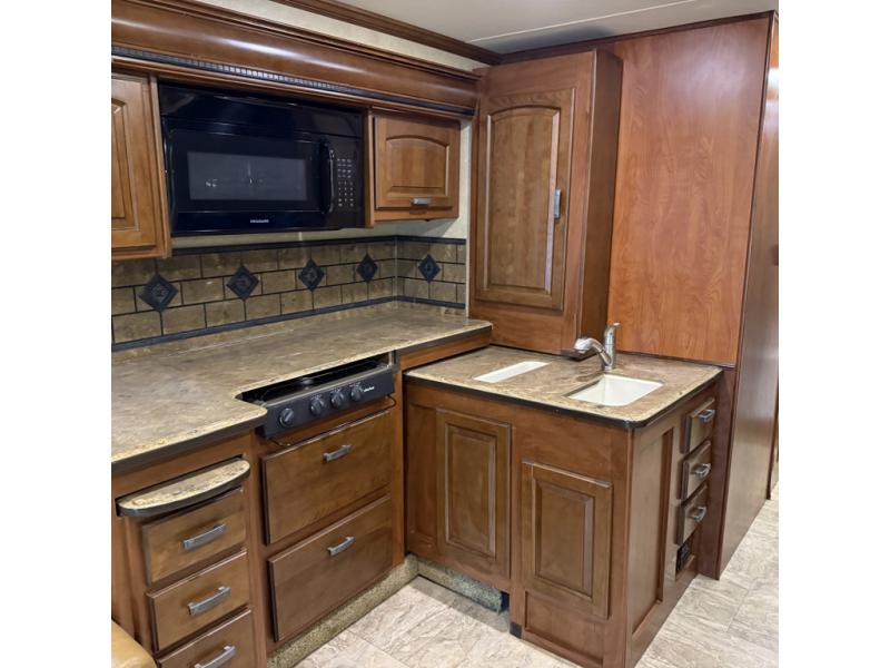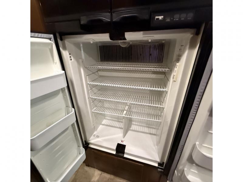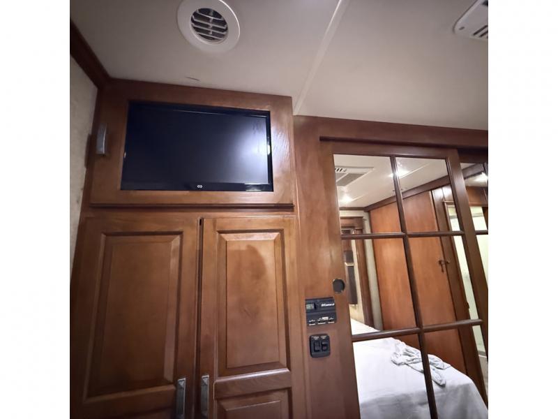 As you enter the motor home, to the left is a slide with a sofa, microwave, hide-a-bed and double kitchen sink. The opposite side offers a dinette ensemble slide, pantry, refrigerator, and second pantry. In the front you will find a front cab-over queen bed, storage, and a LCD TV/DVD.