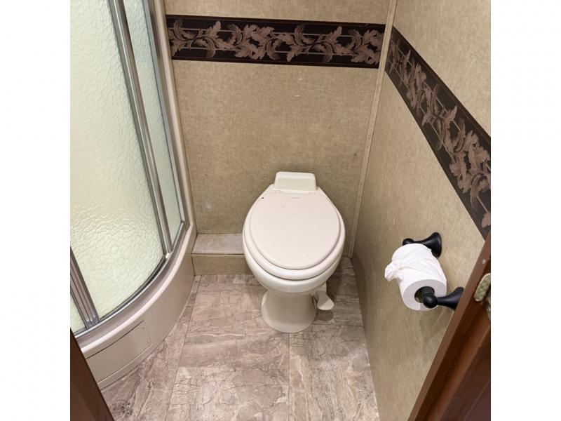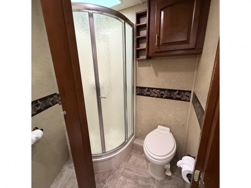 The bathroom has a toilet, and shower on one side of the motor home, and a sink and medicine cabinet on the other side of the motor home.