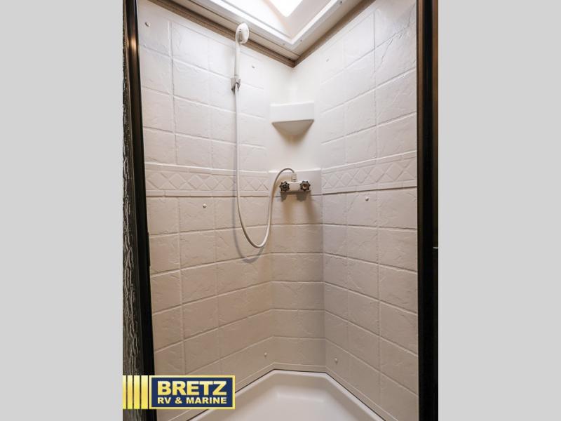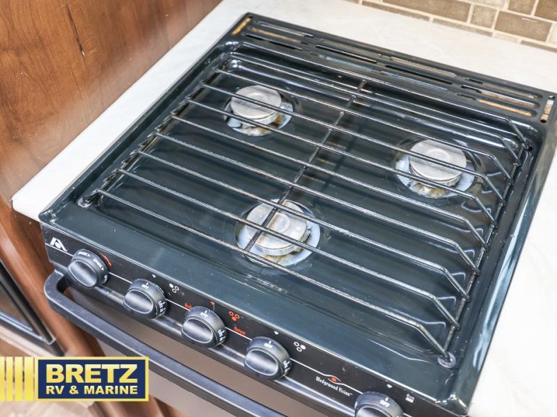 As you enter the 24RKS travel trailer, you will be in the kitchen area. There is a refrigerator, three burner range, microwave, and double kitchen sink. The slide has a pantry, sofa, pantry, and wardrobe. On the opposite side you will find a dinette with a recessed TV above the dinette.