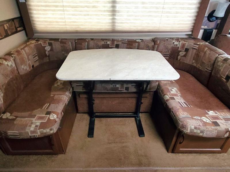 As you enter the travel trailer, to the left is a double kitchen sink, three burner range, microwave, refrigerator, and pantry. The opposite side of the travel trailer offers a u-dinette and a sofa slide. Along the front wall there is an entertainment center and a bench seat.