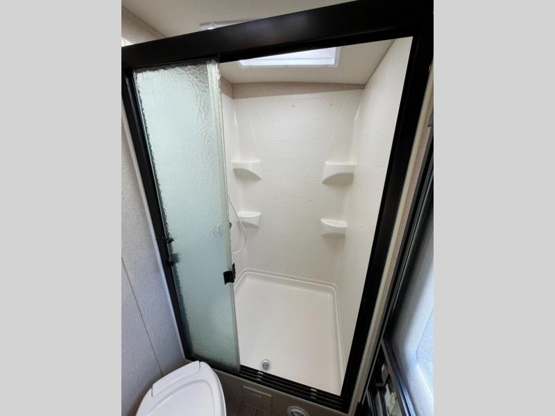 Located in the rear of the trailer you will find the bathroom. Inside the bathroom there is a toilet, shower, sink, medicine cabinet, and private entrance door which leads outside.
