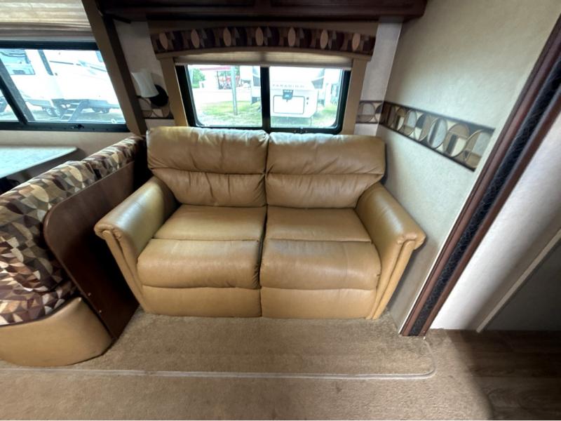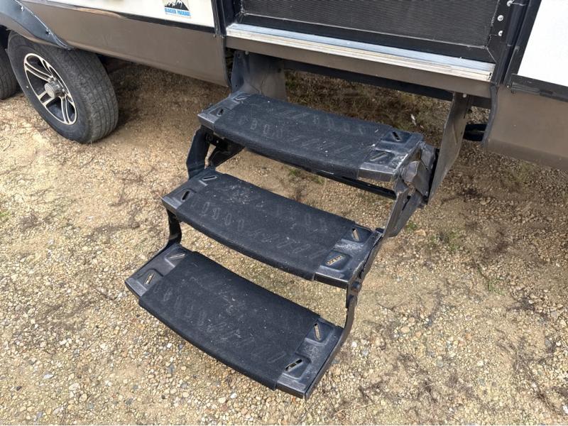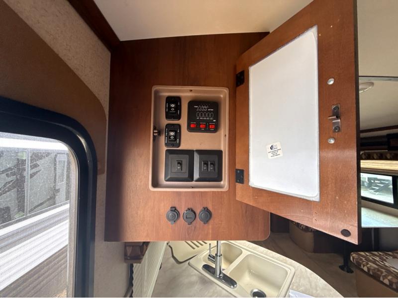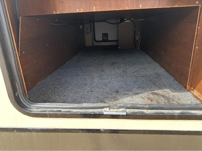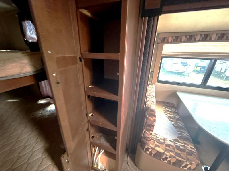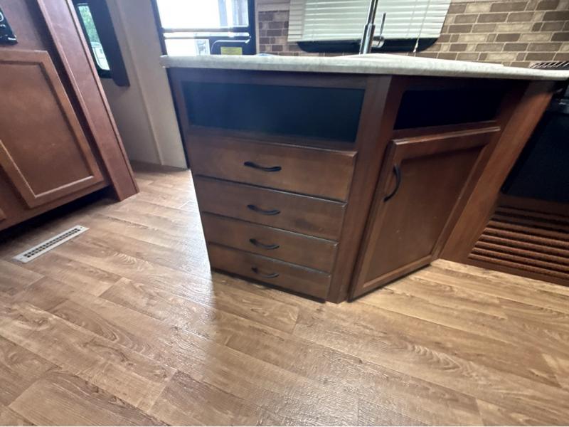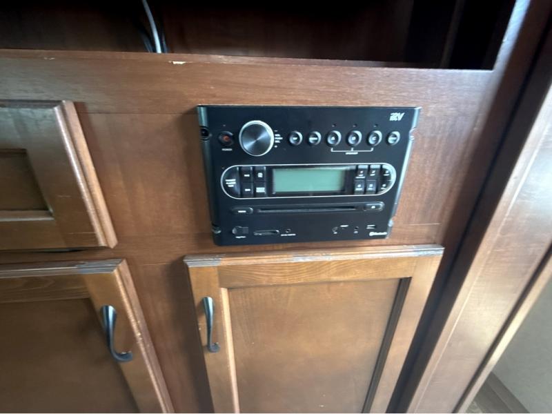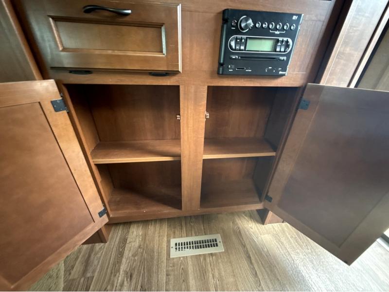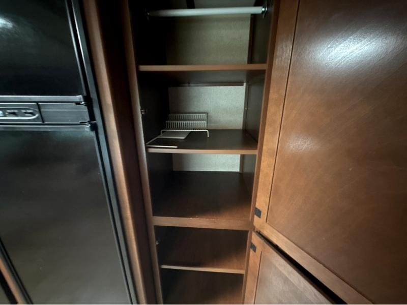 The main living area has a slide with a sofa and dinette. Along one side is an entertainment center for your enjoyment. You will also find a double kitchen sink, three burner range, microwave, refrigerator, pantry, wardrobe and additional pantry.