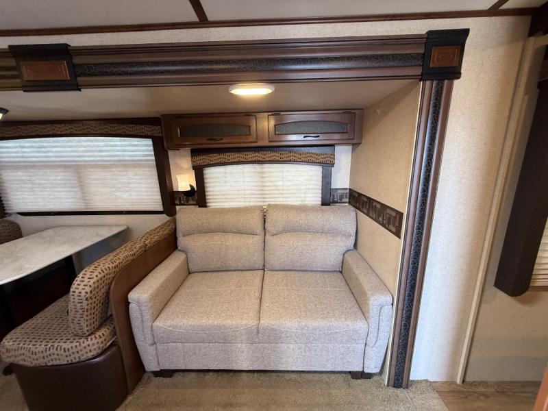 The main living area has a slide with a sofa and dinette. Along one side is an entertainment center for your enjoyment. You will also find a double kitchen sink, three burner range, microwave, refrigerator, pantry, wardrobe and additional pantry.