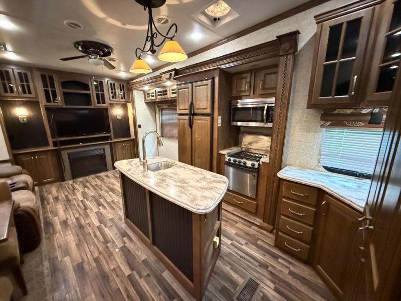 This rear entertainment Keystone Alpine fifth wheel 3010RE features triple slides, a king size bed, and a convenient kitchen island.