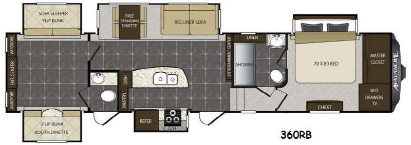 Pack up your family and a few extra friends in this spacious Avalanche fifth wheel by Keystone RV. Model 360RB makes it easy to take along a few extra guests with the rear bunkhouse, one and a half baths, FIVE sides for added interior space, and more!