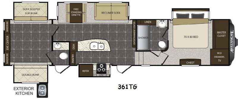 Grab the kids, a few friends, and enjoy traveling in this Keystone Avalanche fifth wheel featuring one and a half baths, an outdoor kitchen, dual entry doors, and FIVE slides!