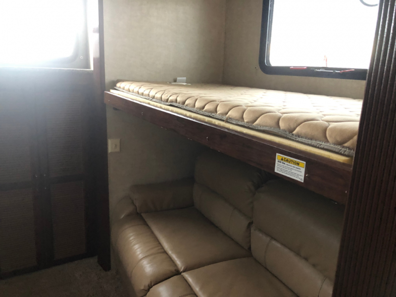 Make your way back through to the rear of this Avalanche unit to the spacious bunkhouse that the kids will certainly want to claim as their own. Inside find a slide out sofa sleeper with flip bunk above on the right side. On the left there is a second set of bunk beds that slide out leaving you a wide open space to enjoy. The rear wall offers an entertainment center with tons of wardrobe and drawer storage on either side for your things. There is also a half bath with private entry including a toilet and vanity with sink just off the bunk room for added convenience.