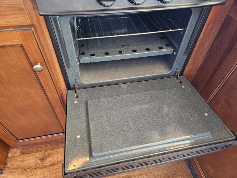 Three-burner range, refrigerator, and pantry provide everything you need for cooking on the go.