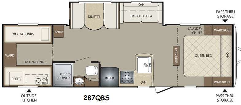 Step into this quad bunk single slide Bullet travel trailer model by Keystone RV and see how convenient camping with a larger family can be. Model 287QBS features quad bunks, a large slide, and an outside kitchen plus more!
