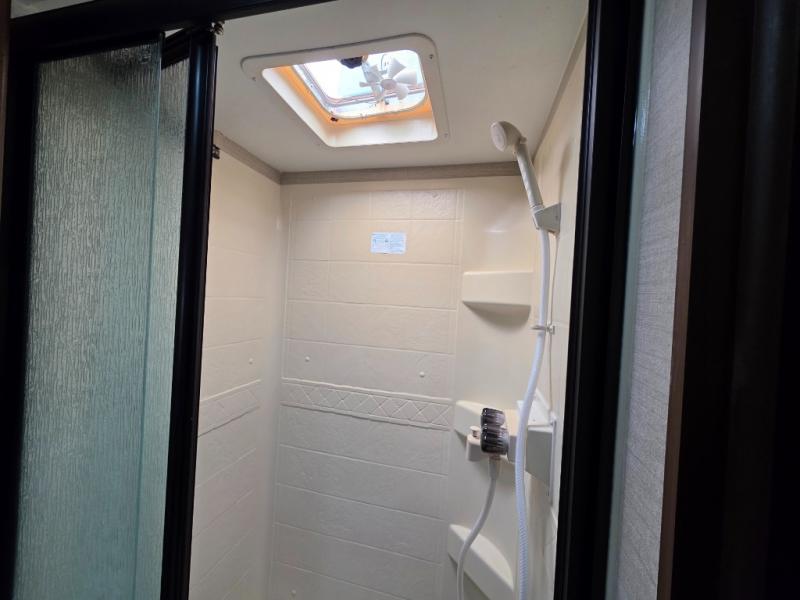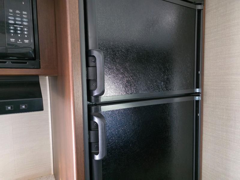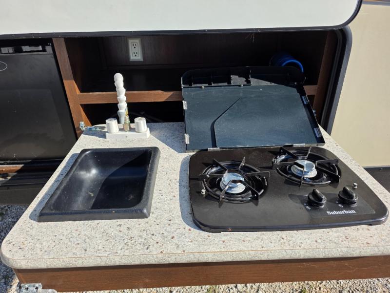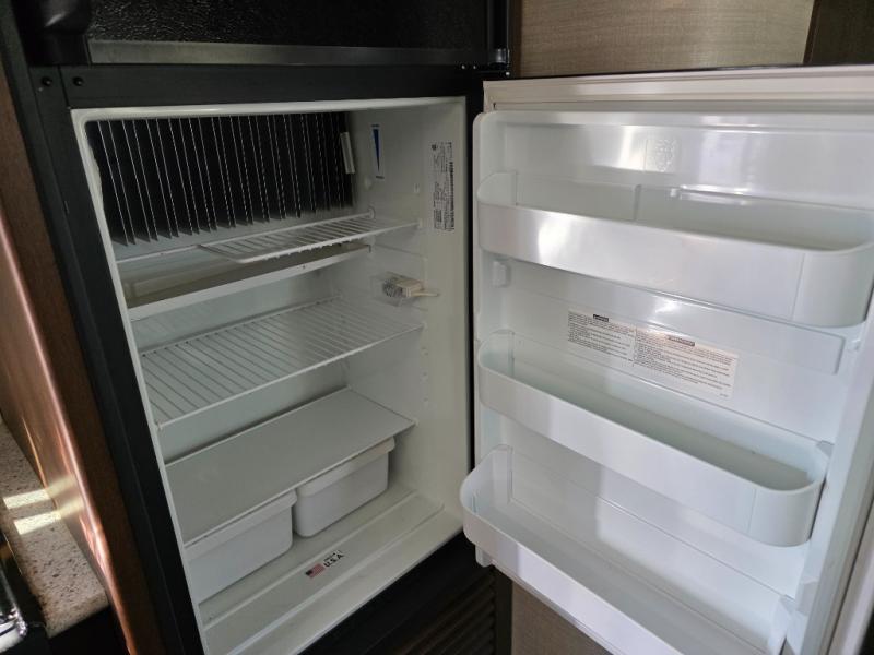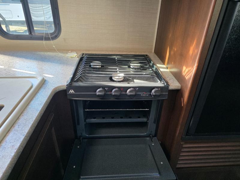 Cook all your family's favorite meals and snacks in the kitchen provided. There is a refrigerator, three burner range, kitchen sink, and overhead storage too. Plus you can find a pantry just to the side of the dinette toward the back.