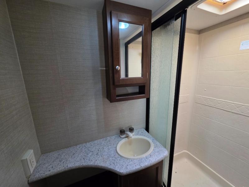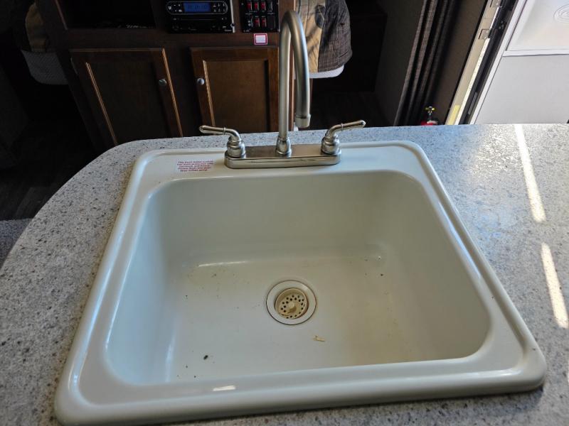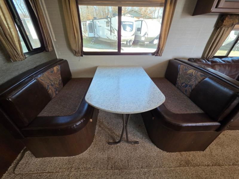 The combined kitchen and living area are made spacious by the large slide out booth dinette and tri-fold sofa which creates another sleeping space at night if needed. The nearby entertainment center can easily be viewed by the seating in the sofa/dinette slide out.