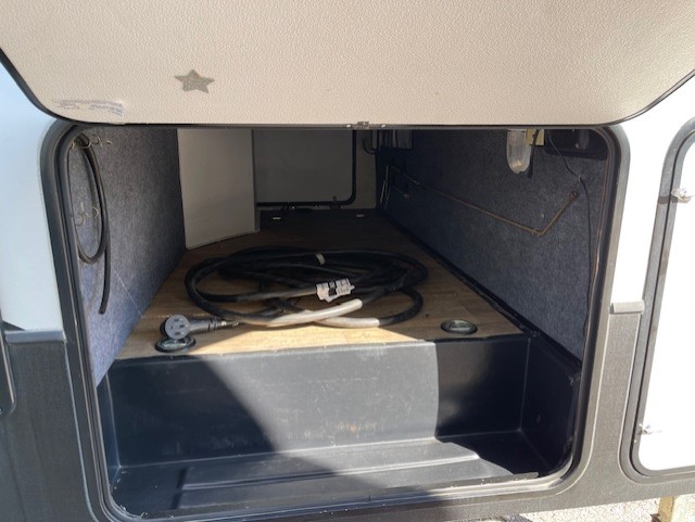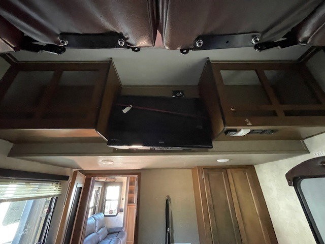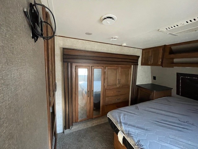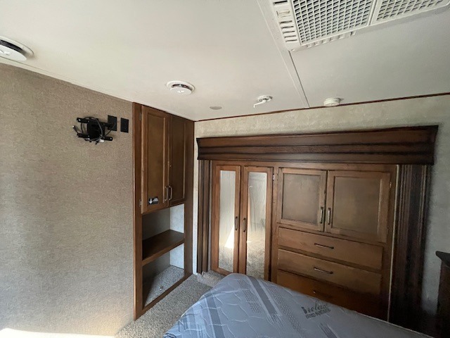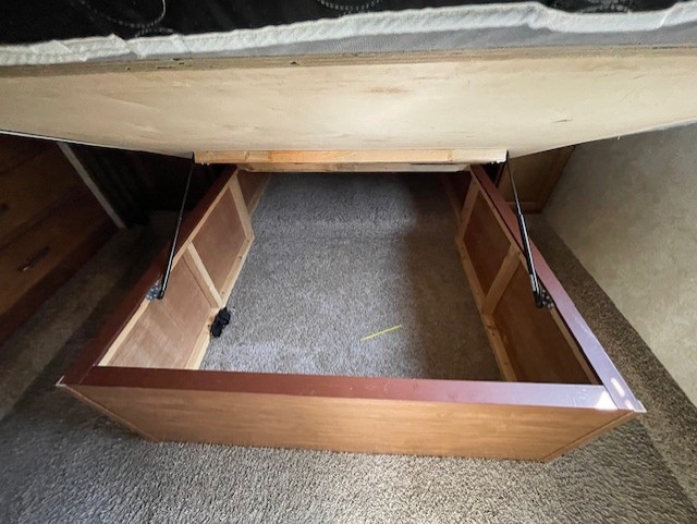 Continue down the hall to the front bedroom featuring a queen bed, dual nightstands, and overhead storage cabinets. There is a large wardrobe slide out which provides a bit more space to move about, and plenty of storage for all of your clothes. There is a second small wardrobe with a laundry chute opposite the bed against the bathroom wall.